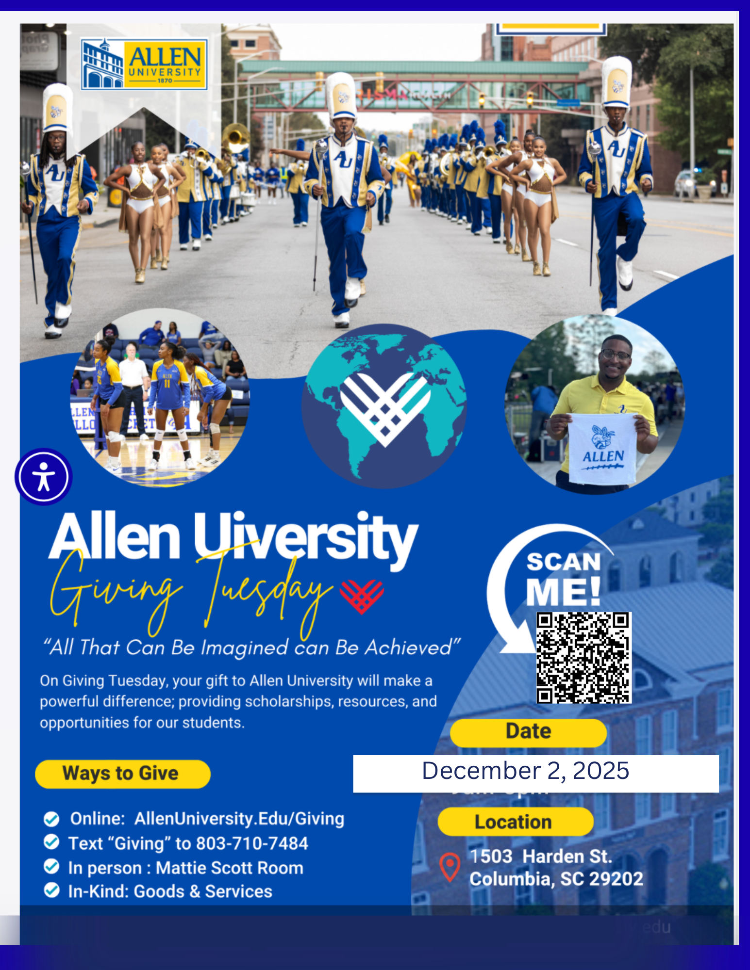 Allen University is deeply appreciative of the contributions of our many generous alumni and friends. We offer several areas for you to contribute: the Annual Fund (our greatest need), the General Scholarship Fund, Endowed Scholarships, other naming opportunities, or several other academically centered areas.