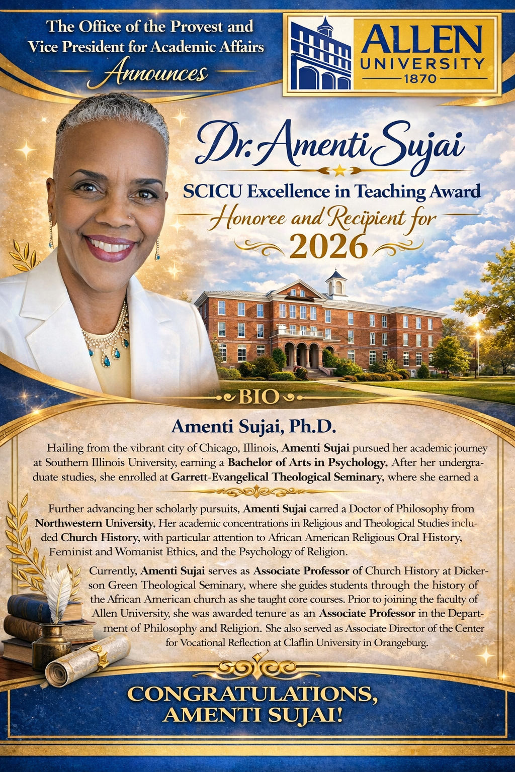 Dr. Sujai has been named the 2026 recipient of the SCICU Excellence in Teaching Award, a distinction that recognizes outstanding commitment to student learning and academic excellence across South Carolina’s independent colleges and universities.